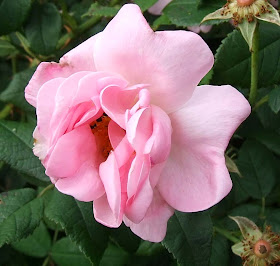 Petit Papillon (Foto folgt) ist eine wüchsige, robuste, öfterblühende, ungefüllte Sorte. Die langgestreckten Knospen sind lachsrosa, die recht großen Blüten im geöffneten Zustand zart weißlich-rosa und sehr interessant für Insekten.